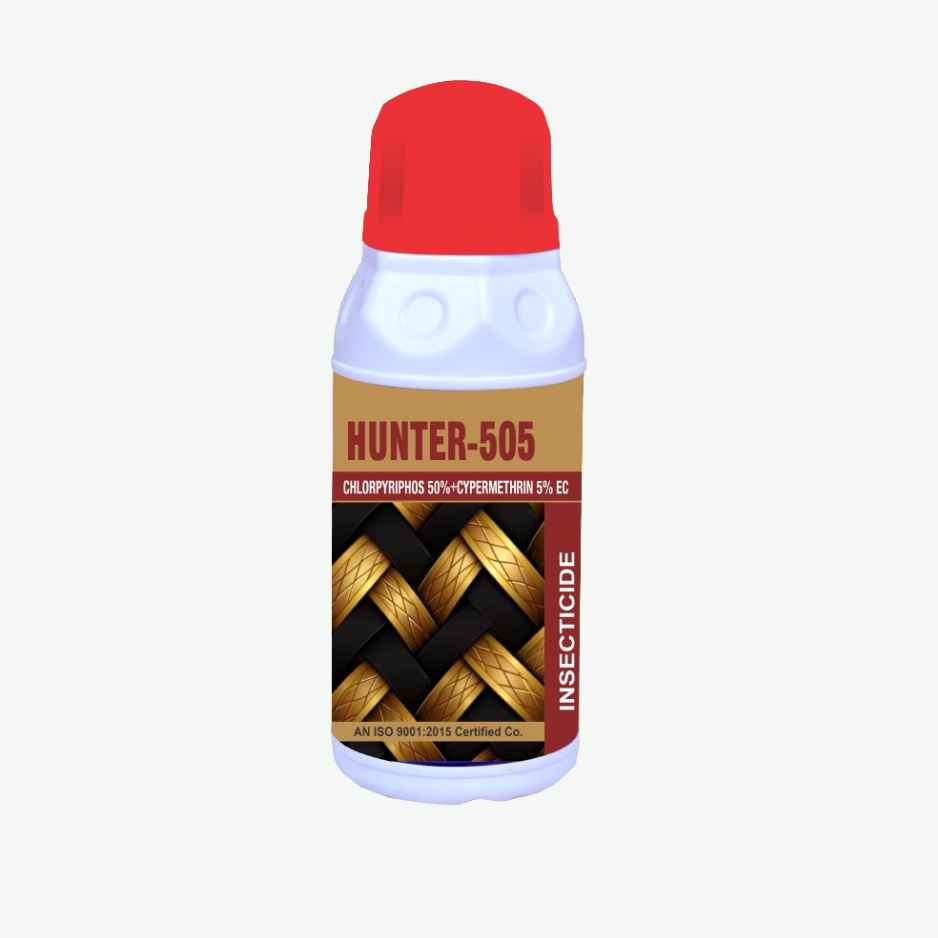 HUNTER-505 is a potent, broad-spectrum control insecticide formulated with Chlorpyriphos 50% and Cypermethrin 5% EC. It is expertly designed to effectively control lepidopteran insects across a wide variety of crops. HUNTER-505 is specifically recommended for controlling a comprehensive list of pests in cotton, including Aphids, Jassids, Thrips, Whitefly, American Bollworm, Spotted Bollworm, Pink Bollworm, and Spodoptera litura.